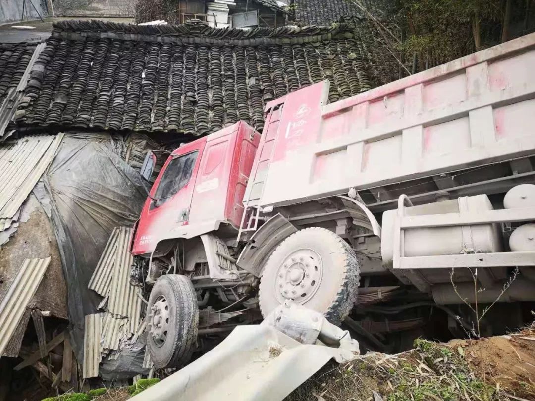 原标题:惊险!新宁一司机驾驭大卡车撞坏护栏翻下路旁边,压塌农家伙房…