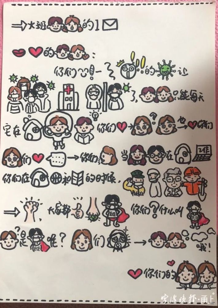 “由于新冠肺炎疫情,假日延伸,孩子们无法回到幼儿园。前几天,咱们和孩子们进行了视频连线,他们说十分挂念教师。”园长王秀华介绍,所以幼儿园大班的教师们就一同参议,用小朋友们看得懂的图形、符号来写一封信。
