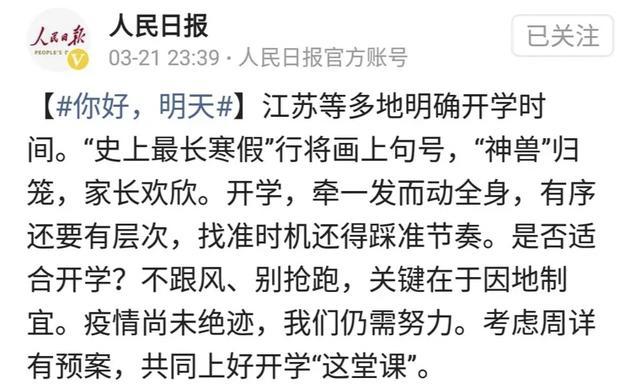 3月20日江苏省发布了开学时刻,但开学时刻发布没多久,就呈现了两例境外输入性病例。正是在这样的状况下,当晚人民日报宣布谈论,发起各地“不跟风,别抢跑”。