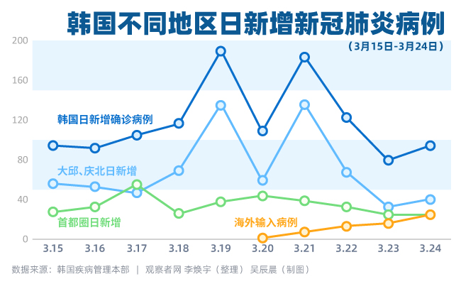 从新增病例来历地上看,大邱市、庆尚北道(32例)尽管仍然是首要来历,但占比大大削弱,首都圈新增病例(20例)已接连14天维持在20以上,海外输入病例(20例)在近两天增加敏捷,现在已同大邱庆北、首都圈成为韩国新增病例的三大来历,占26%。
