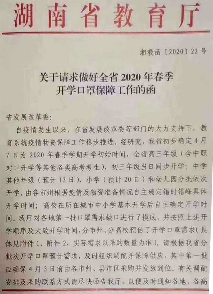 3月27日,一份湖南省教育厅的红头信件(不完全)在网络上撒播,文件号为“湘教函[2020]22号”,题为《关于恳求做好全省2020年春季开学口罩保证作业的函》,文件显现:
