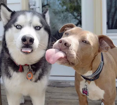 快看!哈士奇一脸的生无可恋脸和一脸的厌弃。而一旁的比特犬则兴致正高的亲吻着哈士奇。这场景,怎一个搞笑了的。