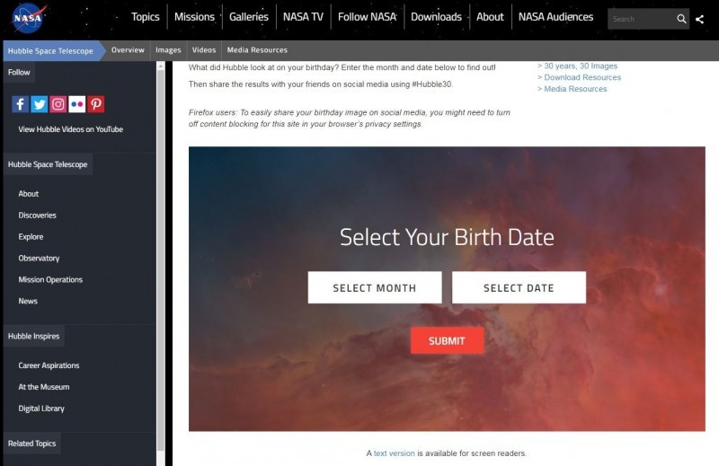 更风趣的是,在NASA的「你生日时,哈勃看到了什么(What Did Hubble See on Your Birthday?)」网站上,群众能够恣意挑选日期,来瞧瞧自己或朋友的生日当天,哈勃在世界中看见了什么。