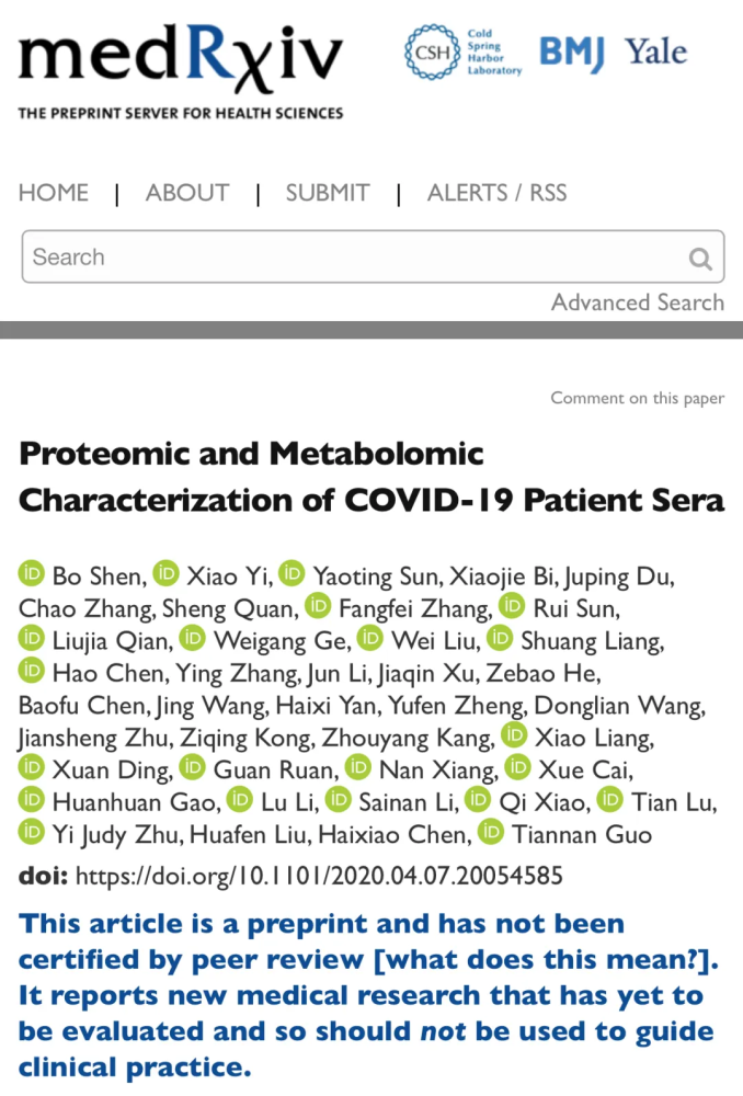 他们和协作团队一同对新冠肺炎患者血液中的蛋白质和代谢物分子进行体系检测,发现重症患者的血清中存在多种共同的分子改动,并找到了一系列生物标志物,有望为猜测轻症患者向重症开展供给导向。